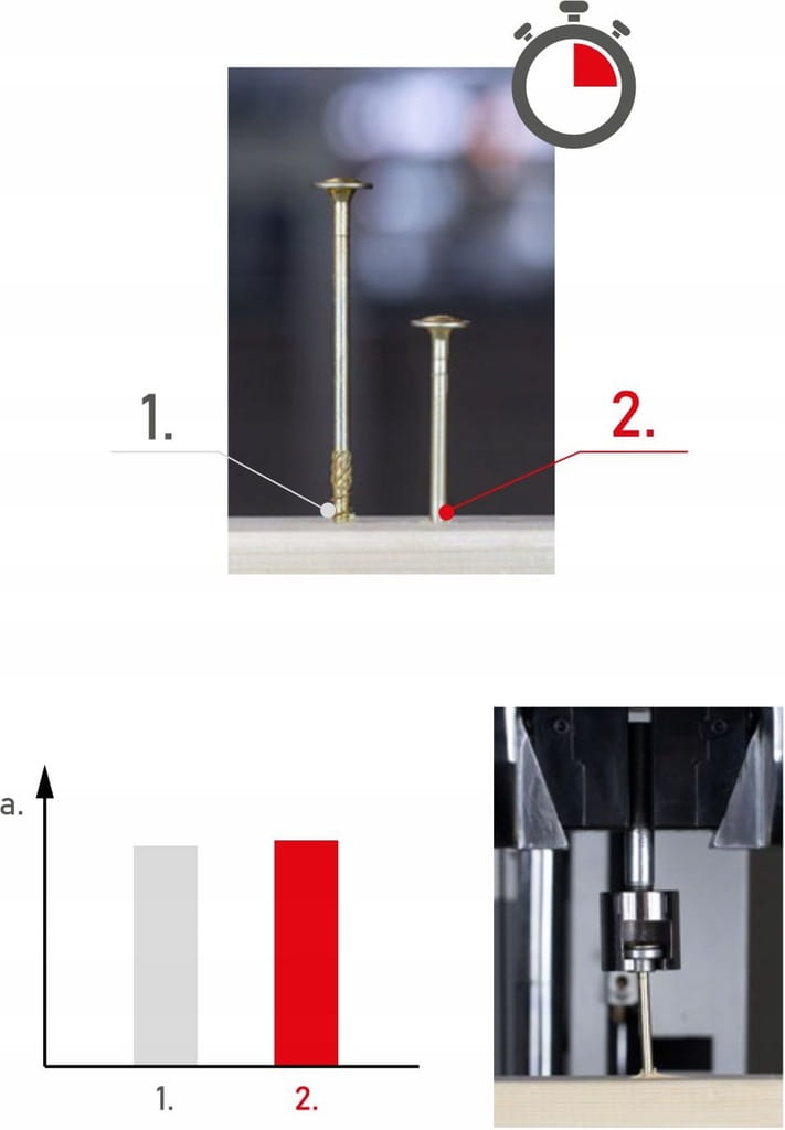 W badaniach prowadzonych przed wdrożeniem produktu potwierdziliśmy, że nowy kształt końcówki wkręta powoduje skrócenie czasu wkręcania nawet o 40% przy tym samym obciążeniu. Oszczędność uzależniona jest od rodzaju połączenia i zastosowanego drewna.