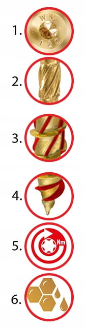 Wkręty przeznaczone są do połączeń elementów drewnianych i drewnopochodnych (płyta wiórowa, sklejka, płyta MDF, płyta OSB). Znacznie ułatwiają i przyspieszają pracę nie wymagając przy tym wcześniejszego nawiercania. Gniazdo TORX efektywnie zapobiega wyskakiwaniu bitu podczas wkręcania.