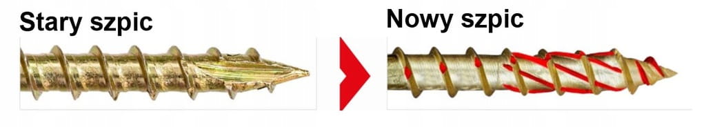 Zaprojektowany we współpracy z wykonawcami nowy szpic wkrętów ciesielskich, ułatwia montaż oraz charakteryzuje się wysokimi parametrami wytrzymałościowymi takimi jak: wytrzymałość na wyrywanie, ścinanie itp.